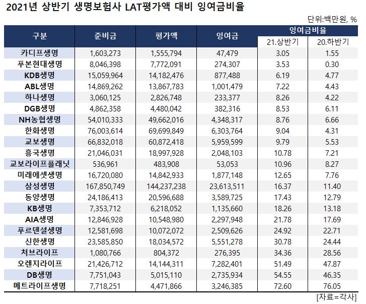 지난 상반기 생명보험업계(라이나생명, IBK연금보험 제외)의 평균 LAT 잉여금비율은 20.02%로 2020년 하반기 16.46% 대비 대폭 좋아졌다. 이는 시중금리 상승에 따라 가용자본이 커진 효과가 반영됐기 때문이다.