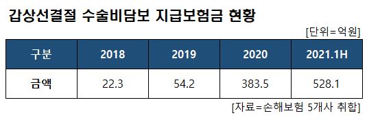 실손보험을 통해 실제 치료비 대부분을 보상받으며, 수술 특약이 있으면 정액으로 많게는 1000만원 이상의 보험금 수령할 수 있다. 또 수술을 반복해서 진행할 수도 있다. 이에 갑상선 결절 치료를 위한 고주파절제술과 관련 지급보험금은 올해 상반기에만 528억원을 기록했다. 2018년에는 20억원에 불과했고, 2019년은 54억원이었다.