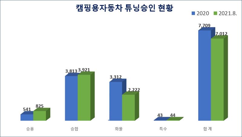 특히 그간 하지 못했던 승용차를 캠핑카로 구조변경이 가능하게 됐다. 이에 승용차를 캠핑카로 구조변경한 대수는 지난해 541대에서 올해 8월까지는 825대로 대폭 증가했다.