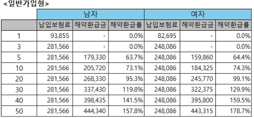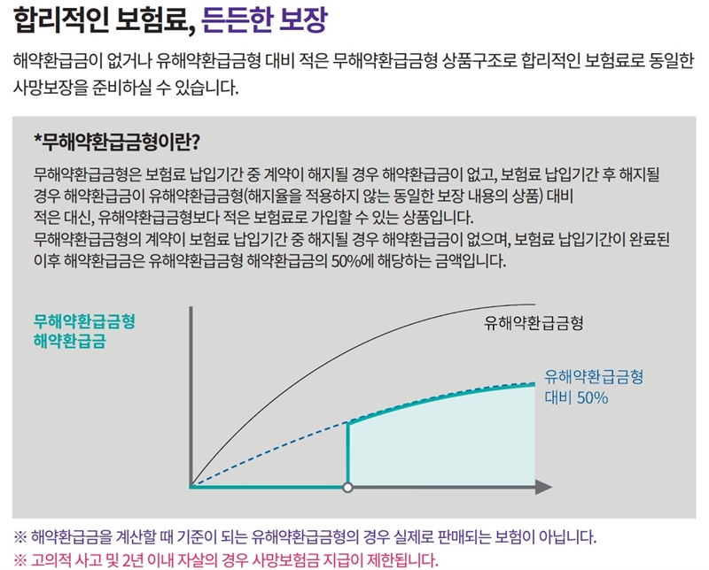 게다가 무해약환급금형입니다. 납입기간 중 해약하면 환급금이 전혀 없습니다. 하지만 보험료를 그만큼 또 낮출 수 있다는 장점이 있죠.