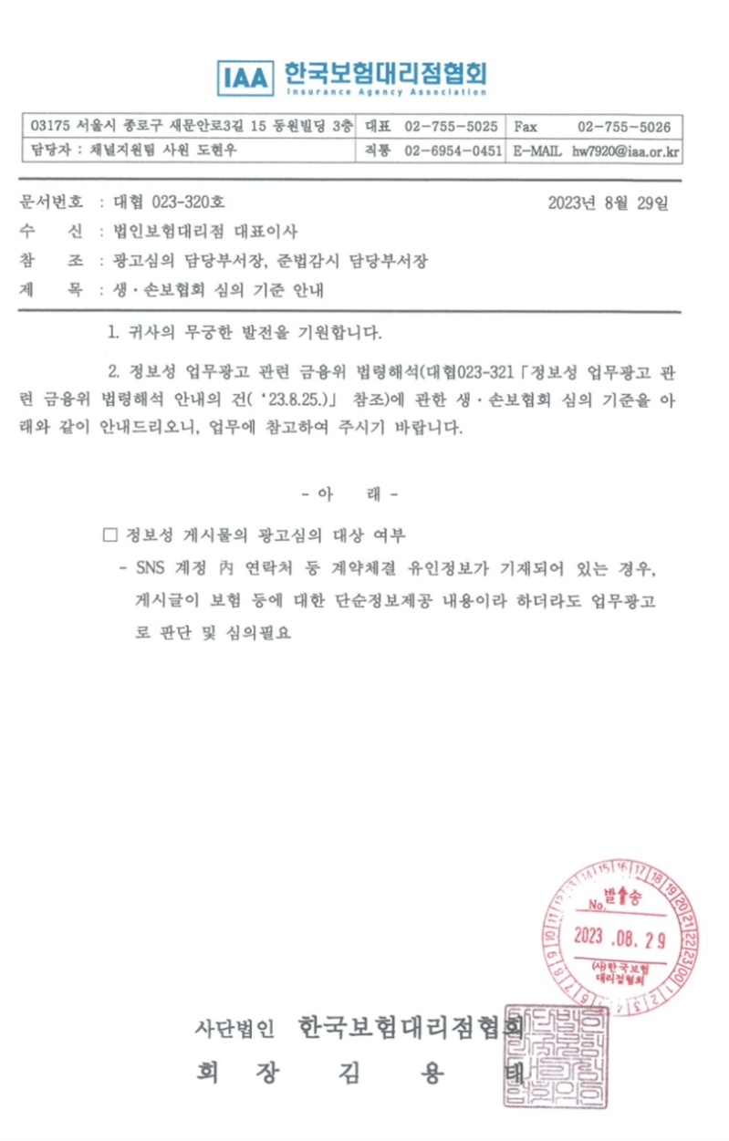 같은 달 한국보험대리점(GA)협회는 해당 법령해석을 토대로 생명·손해보험협회의 광고 심의기준을 각 GA에 안내했다. 당시 GA협회는 “SNS 계정 내 연락처 등 계약 체결을 유인할 수 있는 정보가 기재돼 있다면 게시물이 단순히 보험 관련 정보를 제공하는 내용이라도 업무광고로 판단돼 심의가 필요하다”고 밝혔다.