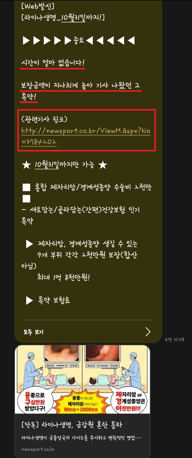 한 라이나생명 지점장은 설계사들에게 “시간이 얼마 없습니다! 보장금액이 지나치게 높아 기사 나왔던 그 특약!”이라며 “10월 31일까지만 가능하다”는 문구와 함께 본지 기사 링크를 첨부했다. 즉 감독당국의 지적을 받은 상품을 절판마케팅하며 기사를 도구로 전용한 셈이다.
