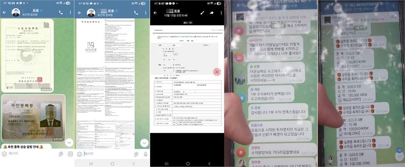 B씨는 2주 동안 매일 수익률을 보고했지만 만기일이 되자 “출금을 위해 새 계좌로 추가 수수료를 내야 한다”는 안내를 했다. 의심을 품은 A씨가 금융감독원에 신고한 결과 단체방의 수익 인증과 대화 내용은 모두 조작된 것으로 확인됐다.